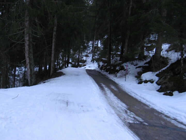 Blaue Talabfahrt 6 (Waldhaus) nach Flims Waldhaus, Hier führt die Abfahrt ein kurzes Stück neben einer Straße her