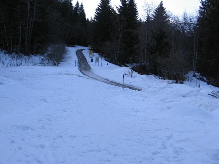Blaue Talabfahrt 6 (Waldhaus) nach Flims Waldhaus, Oben angekommen - Blick zurück, Da musste man einmal über die Straße