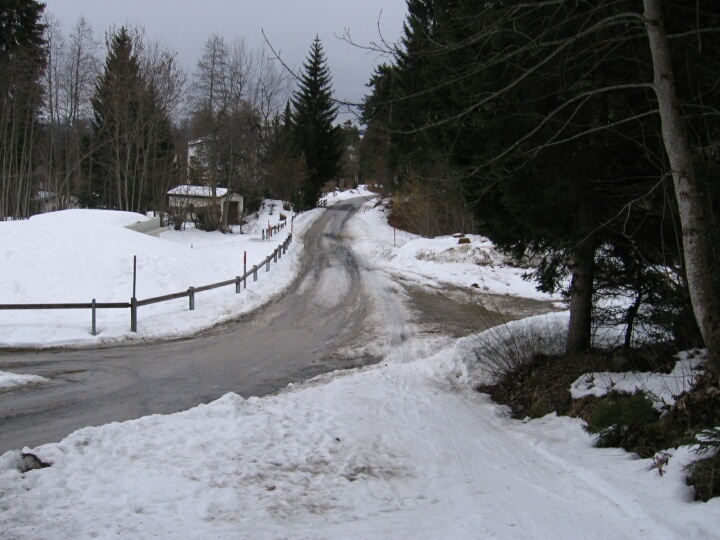 Blaue Talabfahrt 6 (Waldhaus) nach Flims Waldhaus, An einer Straße angekommen - Aber wo geht es jetzt weiter?
