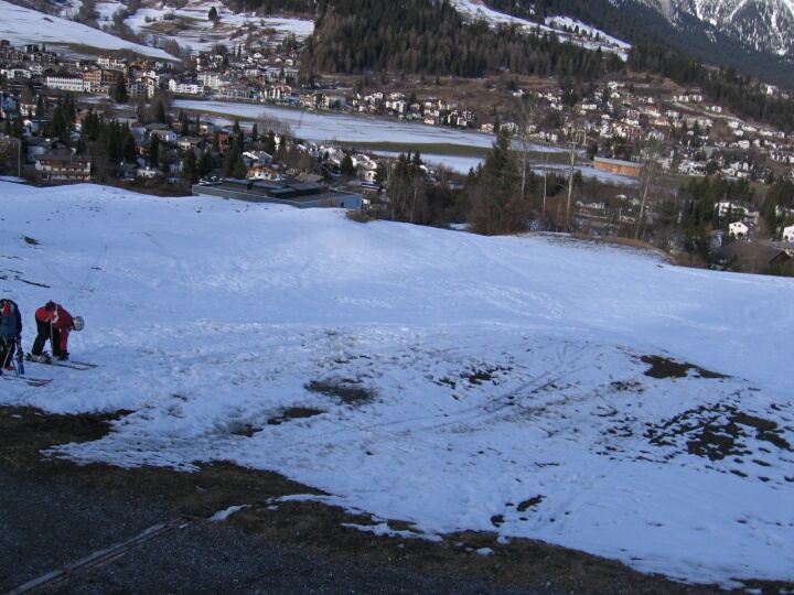Blaue Talabfahrt 6 (Waldhaus) nach Flims Waldhaus, Einmal über die Straße und die Skier wieder anschnallen. Hier stand früher auch mal ein Skilift