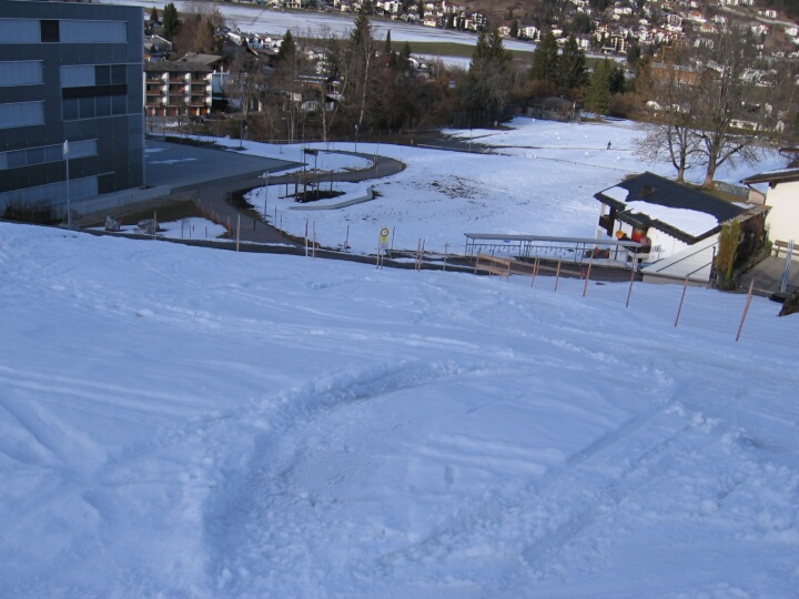 Blaue Talabfahrt 6 (Waldhaus) nach Flims Waldhaus, Und das letzte Stück Abfahrt. Auf dem Schild unten steht, dass die Skipiste zu Ende ist