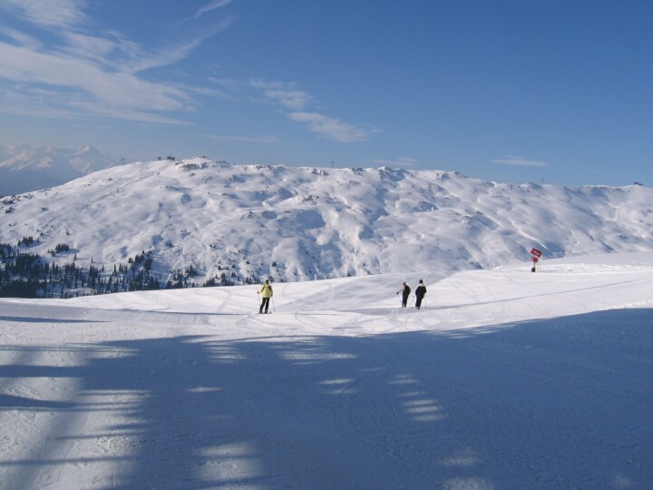 Nagens: Blaue Abfahrt 12 (Mutta), Abzweig der Abfahrten 17 und 25, Man sieht im Hintergrund links Crap Sogn Gion und rechts Crap Masegn