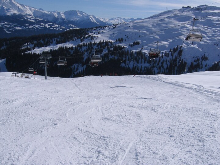 Rote Abfahrt 16 (Mutta Ost), Blick zur 6-KSB/B Mutta Rodunda, Im Hintergrund die 6-KSB/B Plaun mit dem Crap Sogn Gion oben rechts