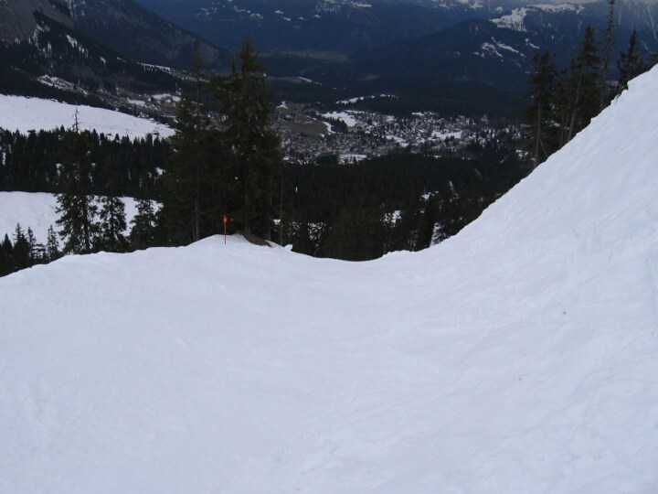Schwarzen Talabfahrt 18 (Stretg) nach Flims, Ende des kurzen Skiweges. Rechts geht es relativ steil hoch und links relativ steil runter und das Baumfrei.