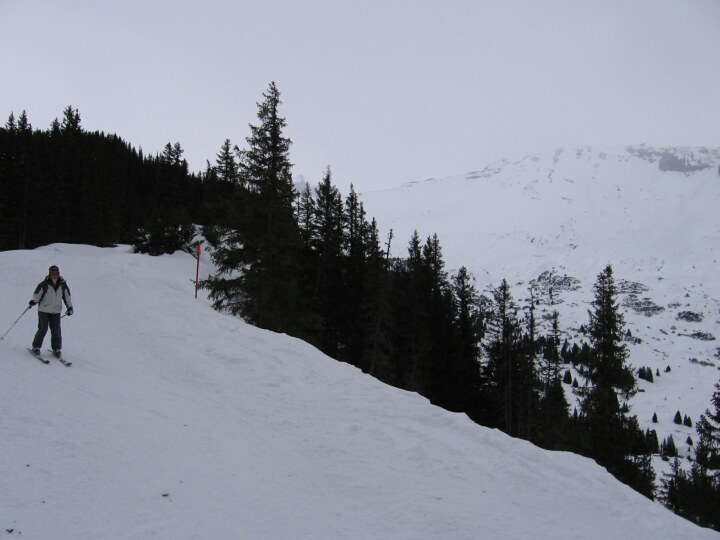 Schwarzen Talabfahrt 18 (Stretg) nach Flims, Blick zurück, Rechts im Hintergrund erkennt man die Bergstation Cassons