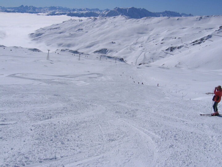 Blaue Abfahrt 31 (Fuorcla Sura), Man erkennt schon die Mittelstation Furocla, außerdem erkennt man die blaue 43 von Alp Dado komment