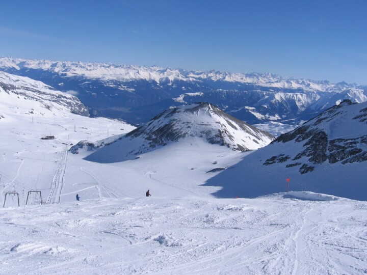 Start der blauen Abfahrt 32 (Beni), Blick zum Vorab Pign und rechts davon der Start der Sattelabfahrt