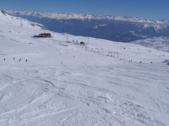 Blaue Abfahrt 32 (Beni), Blick zur Bergstation der 6-EUB Vorab II und den Talstationen der Gletscherlifte
