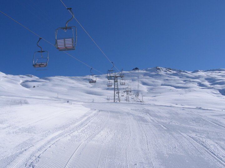 Rote Abfahrt 44 (Masegn West) Rechte Variante, Blick zurück zum Crap Masegn mit DSB Alp Ruschein