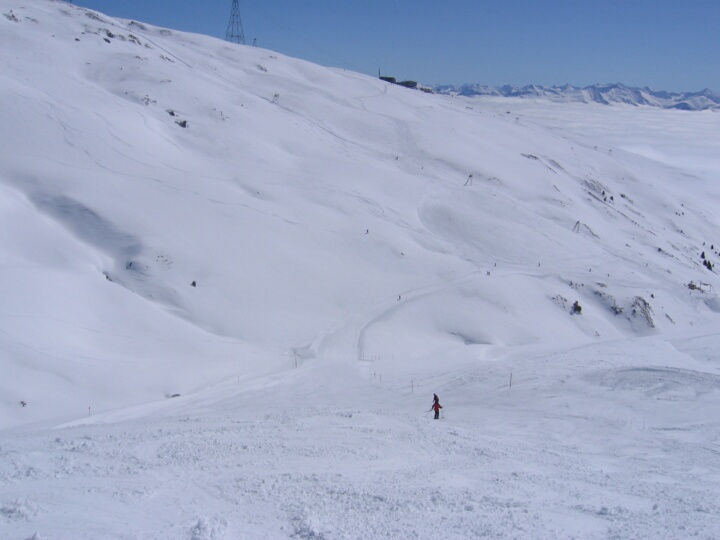 Rote Abfahrt 45 (Crappa Spessa), Im Steilhang, Blick zum 2-SL Treis Palas mit der Talstation ganz rechts