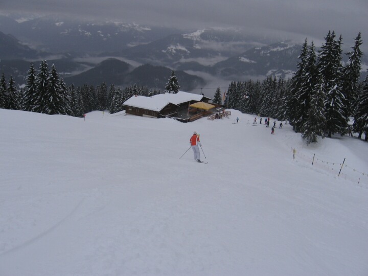Rote Abfahrt 60 (Crap Ault), Blick zum Restaurant Tegia Curnius, Links davon geht die rote 61 ab