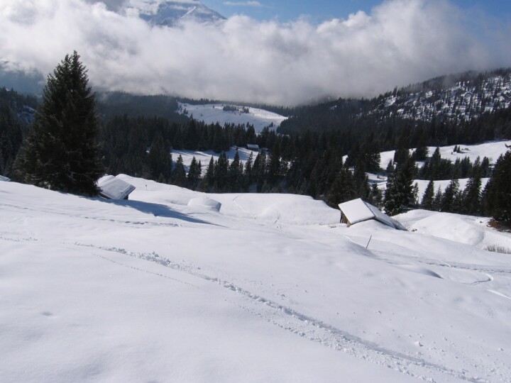 Abfahrtsroute 72 (Heini), Im Hintergrund auf der Lichtung vor den Wolken befindet sich die Runcahöhe und dort führt der Aprena Express entlang