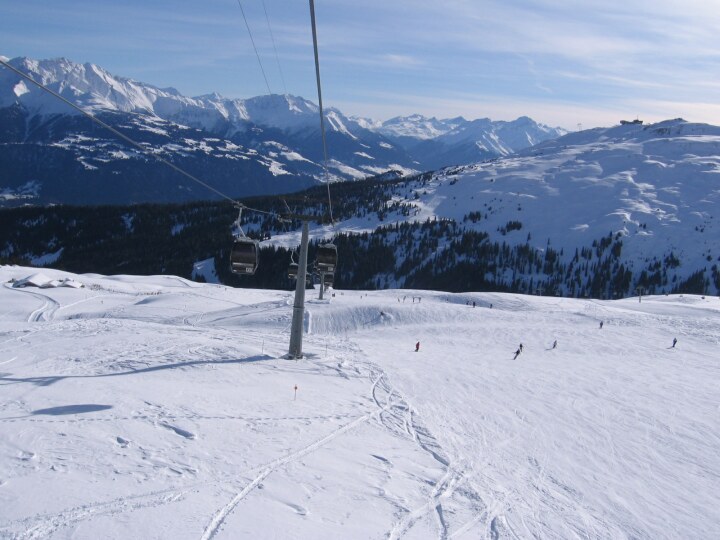 In der 8-EUB Arena Express III, Blick zurück, Rechts unter der Bahn die blaue 12, Rechts oben Crap Sogn Gion